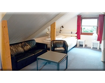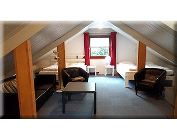 Im DG ist 1 Zimmer mit 2 Doppelbetten oder max. 4 Einzelbetten.